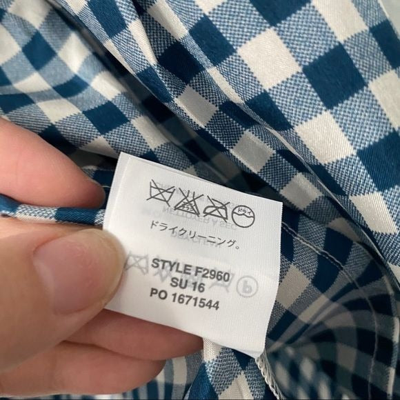 This pretty silk top is light as air with a ruffle hem, flattering contrast piping and one of our favorite prints of the summer: gingham. It is in EUC with no holes, rips, or stains. It is a size 2 Tall. Measurements are shown in the pictures.